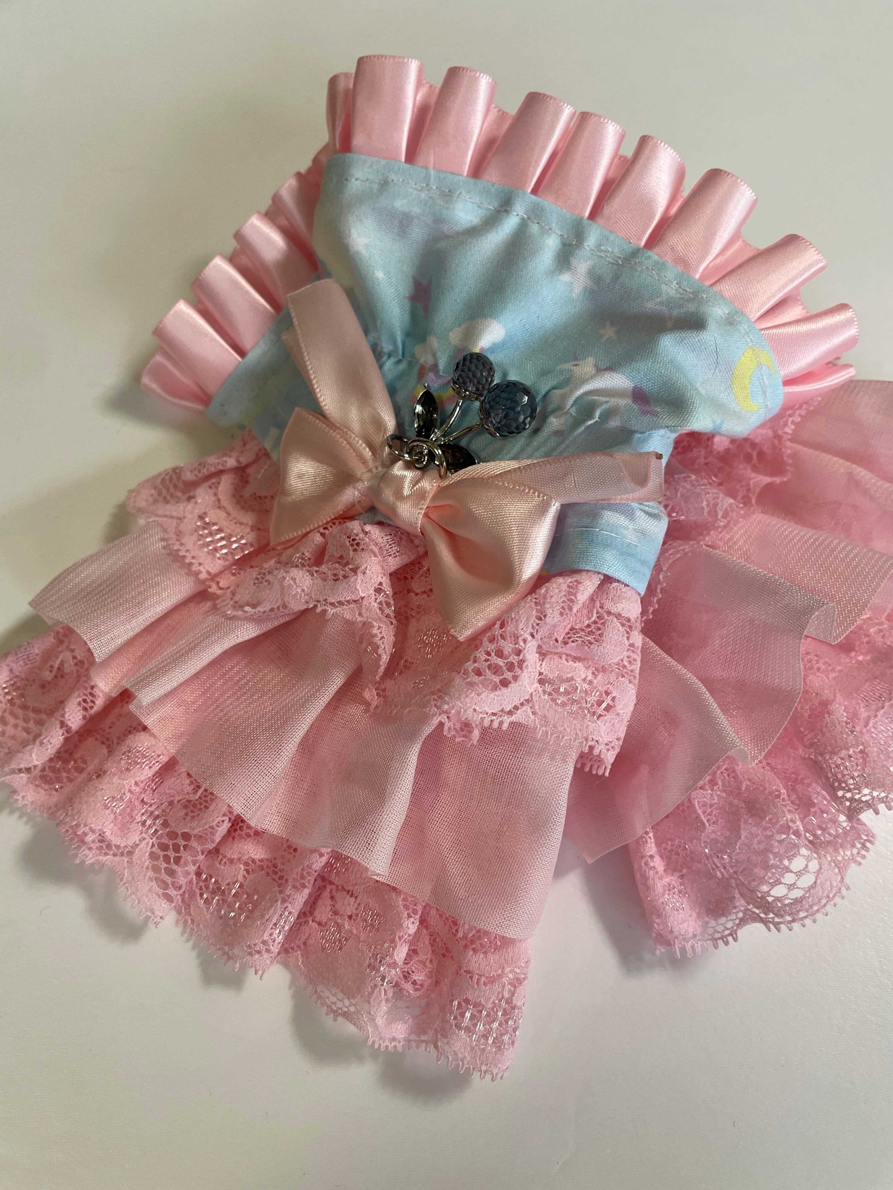 甘ロリスタイルにぴったりな、おとぎ話のように可愛らしいお袖留めです。淡いピンクのフリルとレースがふんわりとしたシルエットを作り、ブルーの生地にはユニコーンや虹が描かれており、ファンタジー感を引き立てます。中央にはリボンが甘さがさらにプラスされるデザインです。