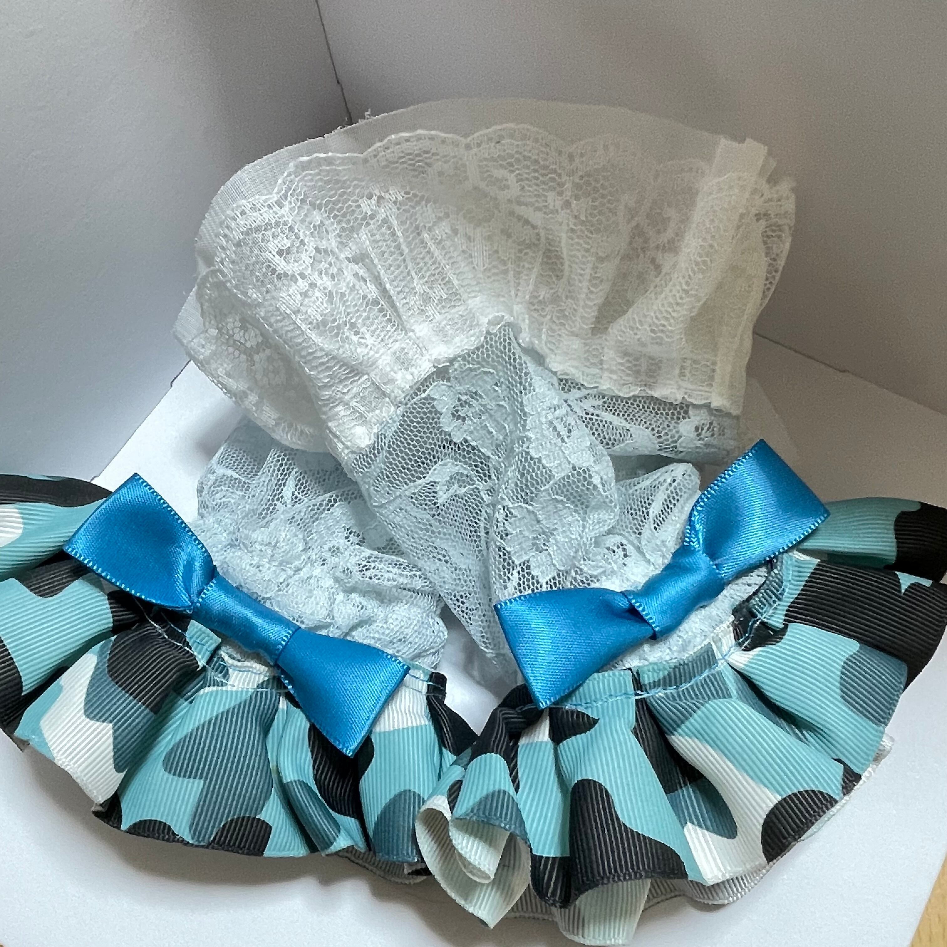 鮮やかな青いリボンと迷彩柄が織りなす個性的なデザイン。繊細な白いレースが軽やかな旋律を奏でるように、和装や洋装にさりげない華やかさをプラスします。特別な日にも日常のおしゃれにも溶け込む、一つで多彩な表情を見せるお袖留めです。