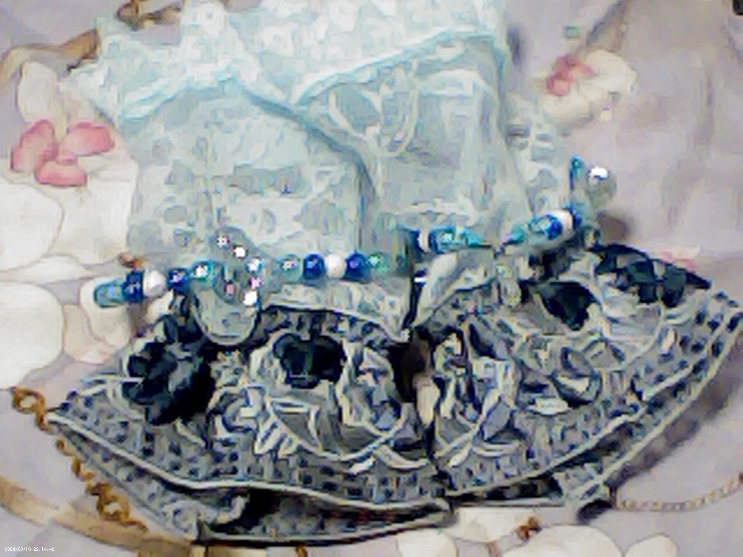 淡いブルーのレースとビーズが涼しげな印象を与えるお袖留めです。