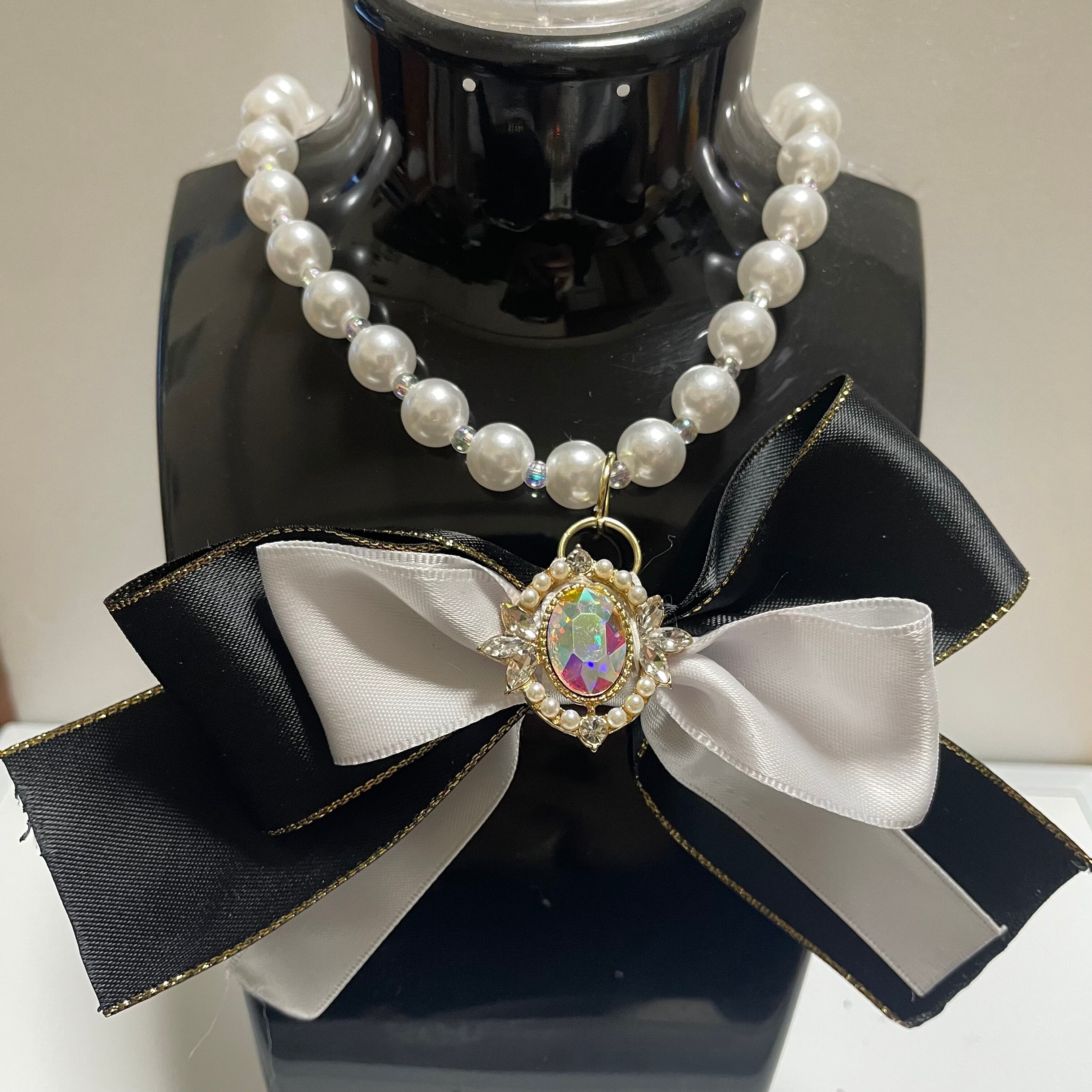パール風ビーズを贅沢に使用したネックレスに、黒と白のリボンを重ねたデザイン。ゴールドの縁取りが上品なアクセントとなり、中央にはオーロラに輝くビジューをあしらいました。